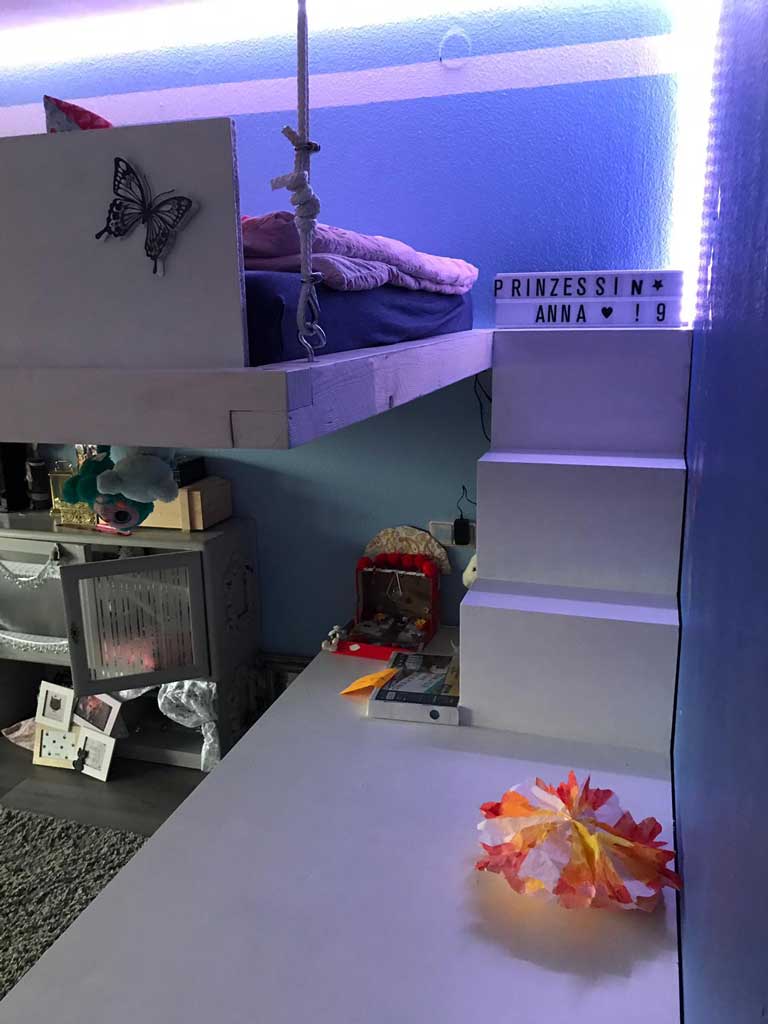 Ich habe ein maßgeschneidertes 140×200 cm Bett konzipiert, entworfen und selbst gebaut, das scheinbar schwebt und gleichzeitig eine praktische Wandstruktur integriert. Die Wandregale dienen doppelt: als Stauraum und als Treppe, die das Bett zugänglich macht.
